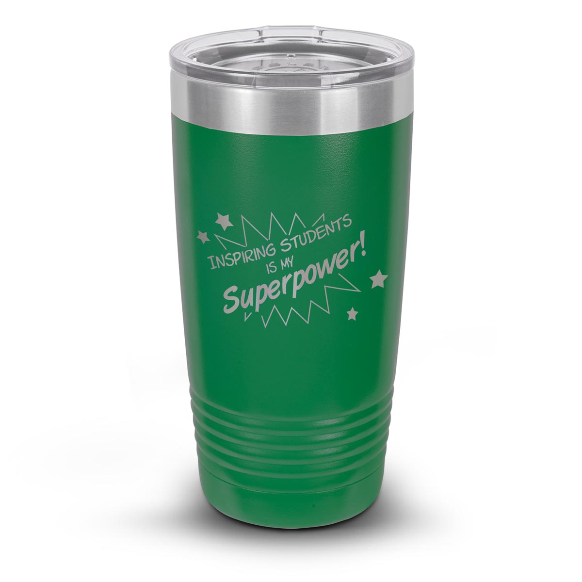 Keep staff hydrated and motivated with this practical gift featuring our exclusively designed “Inspiring students is my superpower!” message laser-engraved onto the tumbler. You will be thoroughly impressed with the crisp silver design the laser creates.
