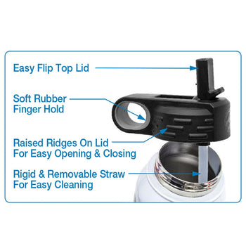 - Featuring a patent pending screw on lid with easy flip top, soft rubber finger hold, raised ridges for opening and closing, and a durable straw that is removable for easy cleaning.