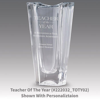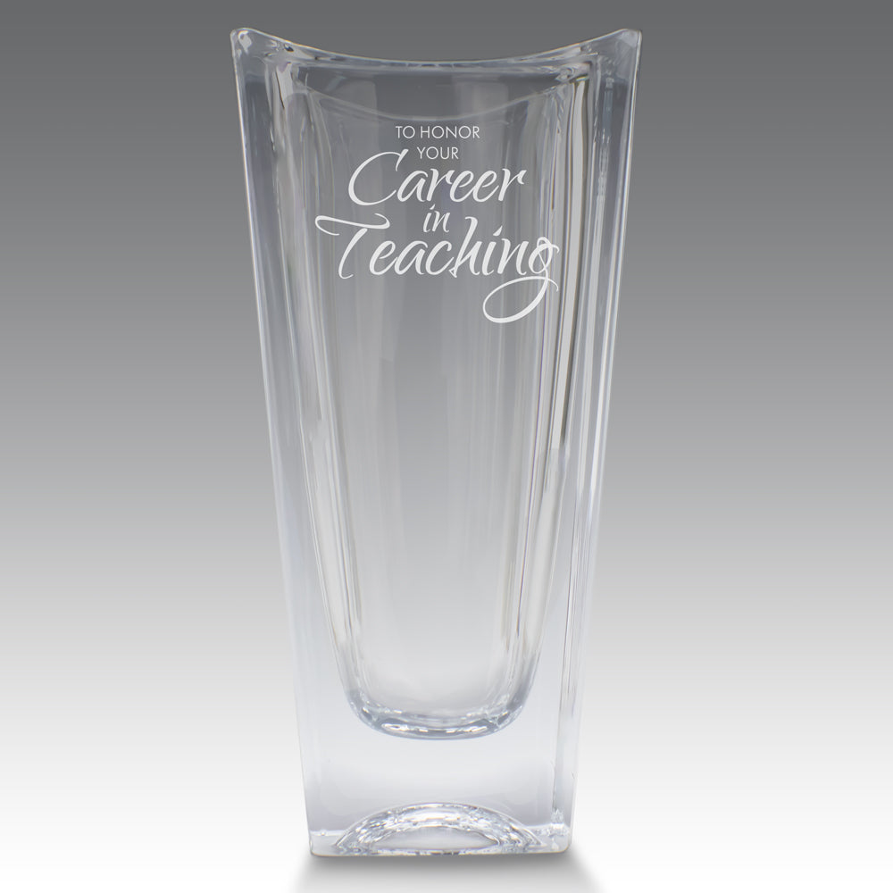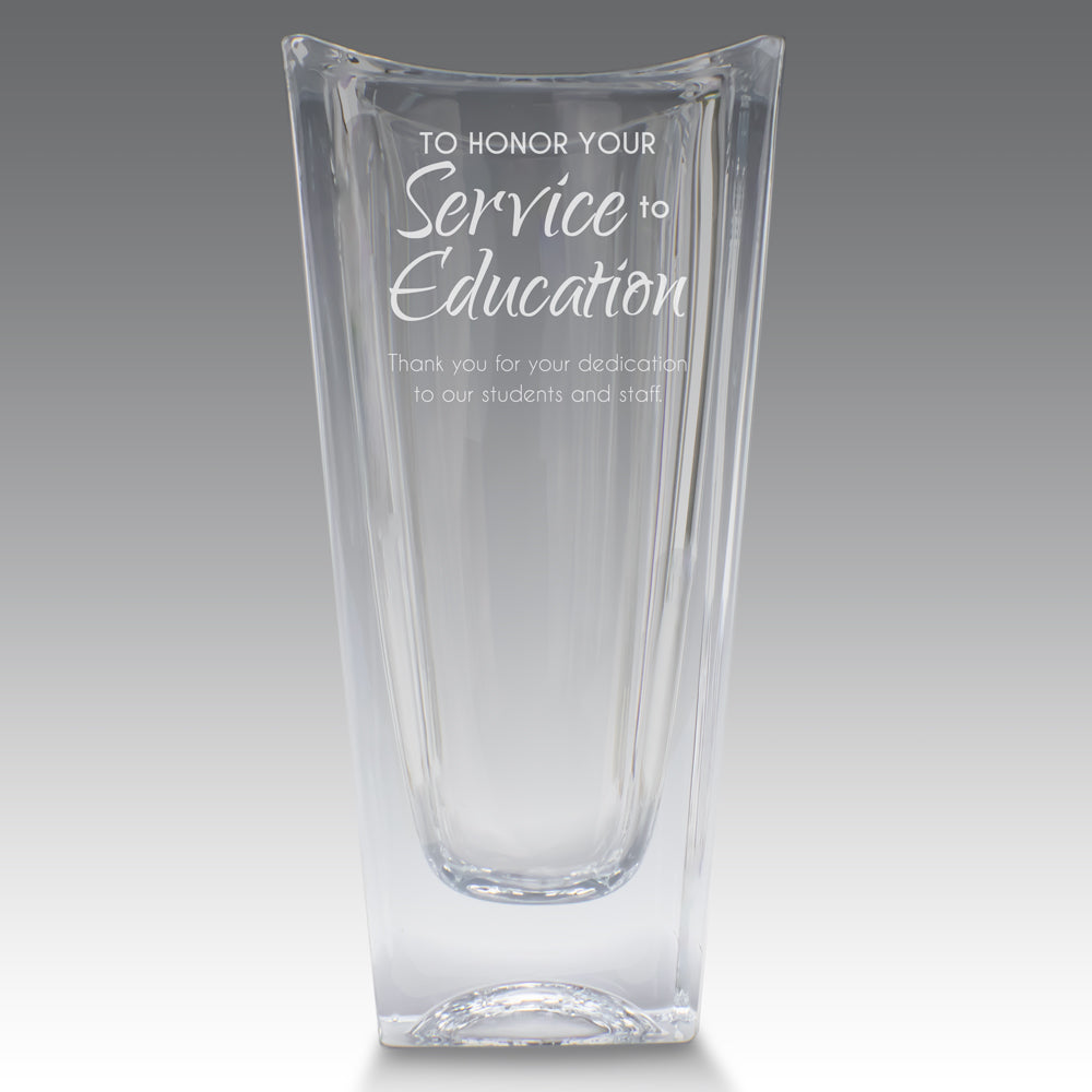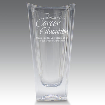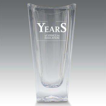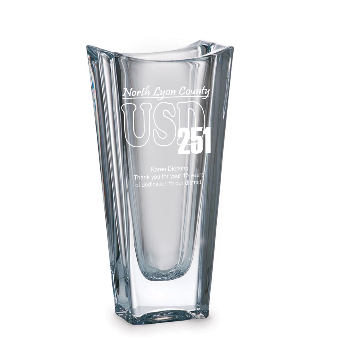 This optic crystal* vase has an elegant concave edge and u-shaped interior. Choose from any of our pre-designed messages and we will sandblast it onto the front of the vase, which produces a stunning frosted effect. Make it special by adding your logo and/or personalized message.