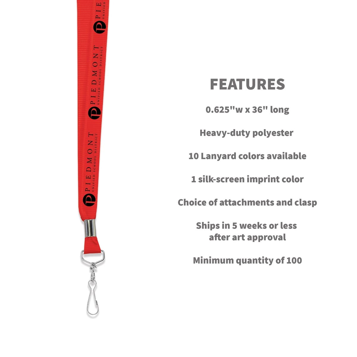 Our high-quality lanyards are not only practical but a great way to showcase your school pride! Offered in a range of school colors, this durable lanyard can feature your logo in 1 color. It’s made of heavy-duty polyester and measures 0.625"w x 36" long. Choose from 3 free easy attachment options for your keys, badges, or other belongings.