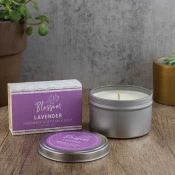 This gift set includes an 8 oz. candle tin filled with handmade soy wax and a 5 oz. bar of all-natural goat’s milk soap, also handmade in small batches for ultimate freshness.