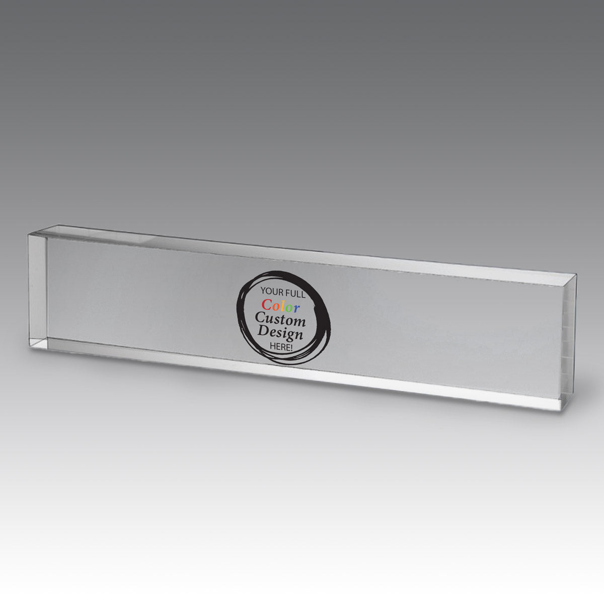 This acrylic desk sign is a budget-friendly gift for schools and other educational institutions. The clear acrylic nameplate design delivers a timeless yet modern look while ensuring long-lasting durability for classrooms, offices, and reception areas. Customize with a full-color logo by uploading artwork above or use the Special Instructions box to share your design ideas with us and let our team do the rest!